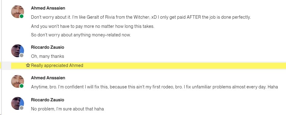 As an expert, it does bother me when a customer pulls this crap, because first, she should’ve been the one to consult with me first before hiring some incompetent prick, because if they messed something up, I’d be the one cleaning up their mess, assuming I wouldn’t be accused of messing things up myself. I knew I shouldn’t have bought into her fake zen “Dream School” bullshit, which is just another greedy capitalist’s attempt at selling bullshit, and I don’t get why people lack the common sense to see past that voodoo nonsense. I expected the Italian guy to be racist or something, and it turned out he was a fucking angel. Now, why would the Italian guy’s experience be any positively different? I’ll tell you why; I pour my heart, and soul into everything that I do, and unlike the bitch who left me the 4-star feedback, the Italian guy was appreciative of all my efforts, and he was mature enough to realize that he had no reason to boss me around whatsoever, and that’s the kind of people I’d rather spend my time helping. He was literally like, “First, let’s talk about the contract.” And I was like, “You don’t have to worry about that, so no matter how long it takes to help you with your problem, you’ll pay the same amount we agreed on.” That was the first time he used my name in a message, which showed his acknowledgment, and his appreciation of who I am as a service provider.